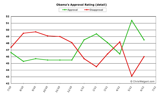 This may not hold true for the rest of this month, however. The political world in July is going to focus on the huge struggle over raising the debt ceiling, a face-off between Obama and the Republicans in Congress which must be resolved by the beginning of August. The next few weeks of this contest are going to be key in the way the public reads the whole battle. Obama has positioned himself as the reasonable adult in the room, willing to make concessions, but also requiring concessions on both sides. The Republicans have positioned themselves as Tea Party absolutists on anything they call a "tax," and show absolutely no signs of backing down. Meaning that whatever happens, the positioning is going to be key in the month of July. If Congress does actually push it past the deadline and economic catastrophe happens worldwide, it'll happen in August and not in July, so the more dire consequences of this political battle likely won't show up next month.