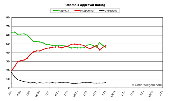 [Program Note 1: Obama Poll Watch is presented today, rather than on its normal Monday, Wednesday, and/or very-occasional Friday. This is mostly due to the column being extremely short this month, and due to the fact that it was pre-empted yesterday because we were all so consumed with the debt ceiling deal announced over the weekend. We apologize for the inconvenience, and for the shortness of the column. More on that in a moment.]
