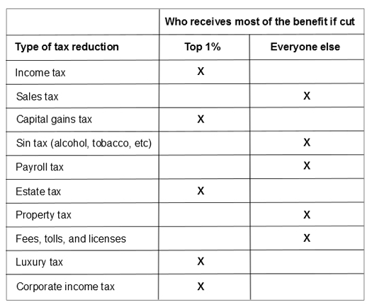 To summarize, here's a table that shows who benefits most from cuts to these 10 forms of taxation: